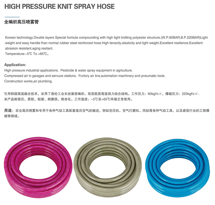 用途:農(nóng)業(yè)高壓噴霧和專(zhuān)用于各種氣動(dòng)工具配套高壓空氣的輸送,例如空壓機(jī)、空氣打磨機(jī)、風(fēng)鉆等各種氣動(dòng)工具。以及建筑行業(yè)的工程爆破等領(lǐng)域。